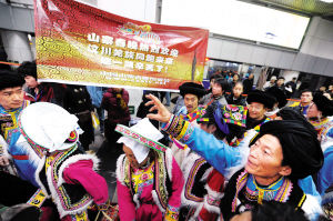 昨天下午1点左右,25名来自四川阿坝藏族羌族自治州的羌族演员,乘坐了一天一夜的火车抵达北京。他们一边唱着家乡的歌,一边走出了北京西站,并打出了感谢首都人民的横幅。他们表示,大家基本上都是第一次来北京,在这次四川地震中,很多人家里也都受灾了,现在他们正在重建家园。他们非常感谢首都人民的帮助,所以他们想通过这样一种特殊的形式,对首都人民表达他们的谢意。其中一位姓孙的演员对记者说:“我们知道上山寨春晚是在一个月前,大家也都没有什么准备,只是领队的人将我们召集起来,合练过两三次。”据另一位演员透露,他们准备了五六个节目,但是最终能用几个,几个能上山寨春晚,还要听节目组的安排,他们不但穿着自己民族特有的服装,还带来了特有的鼓和乐器,25个人全部都是非专业演员,准备的节目也是原生态的。图为羌族演员抵京。晨报记者 李木易/摄